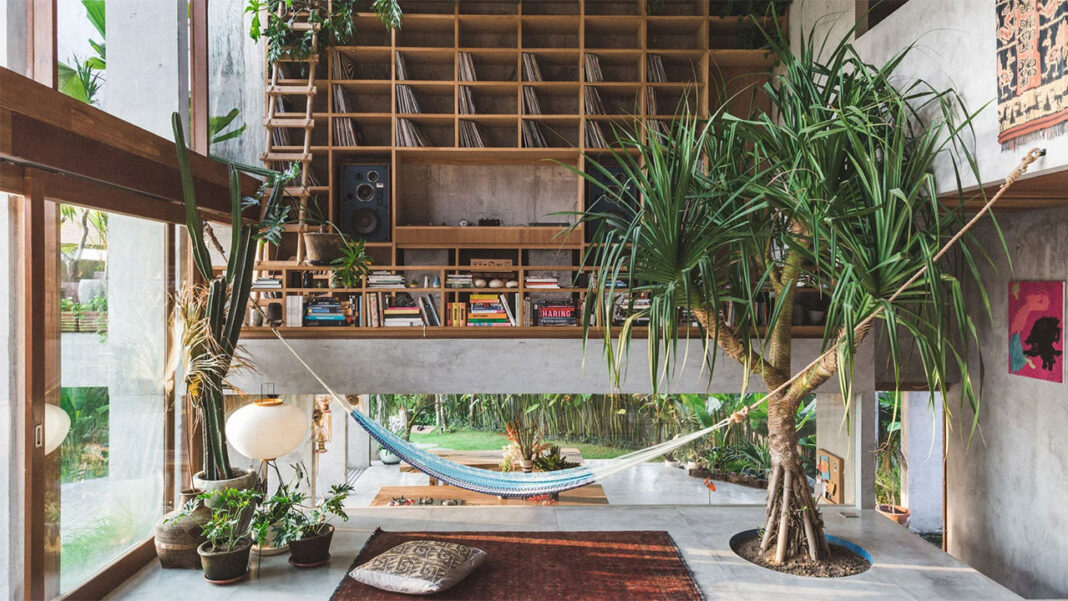 Located in Bali within fields of rice, the Brutalist Tropical Home is designed by Patisandhika Sidarta (now of architecture firm Sidarta and Sandjaja) and designer Daniel Mitchell with large open air spaces and a multi-level layout. In the living room, there’s a hammock for relaxing alongside a tree planted right into the concrete floor.