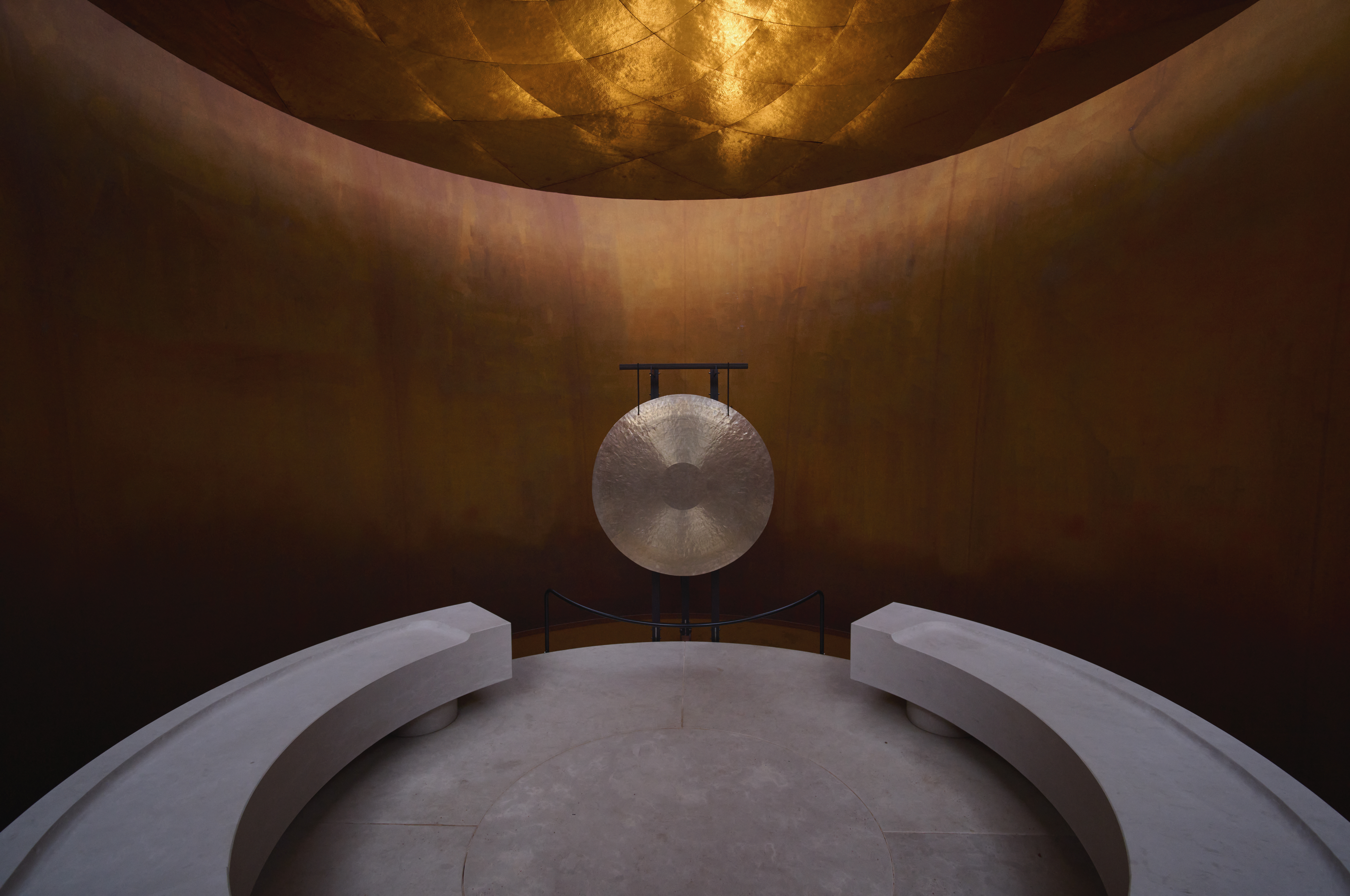 At the heart of the structure lies a circular chamber, open to the sky. Two stone benches flank a shallow ring of water surrounding a solitary gong — the only object in the otherwise minimal space. Here, sound and light become the building’s primary materials. Rainfall, wind, and reflection animate the retreat, creating a place that changes continuously with time and weather.