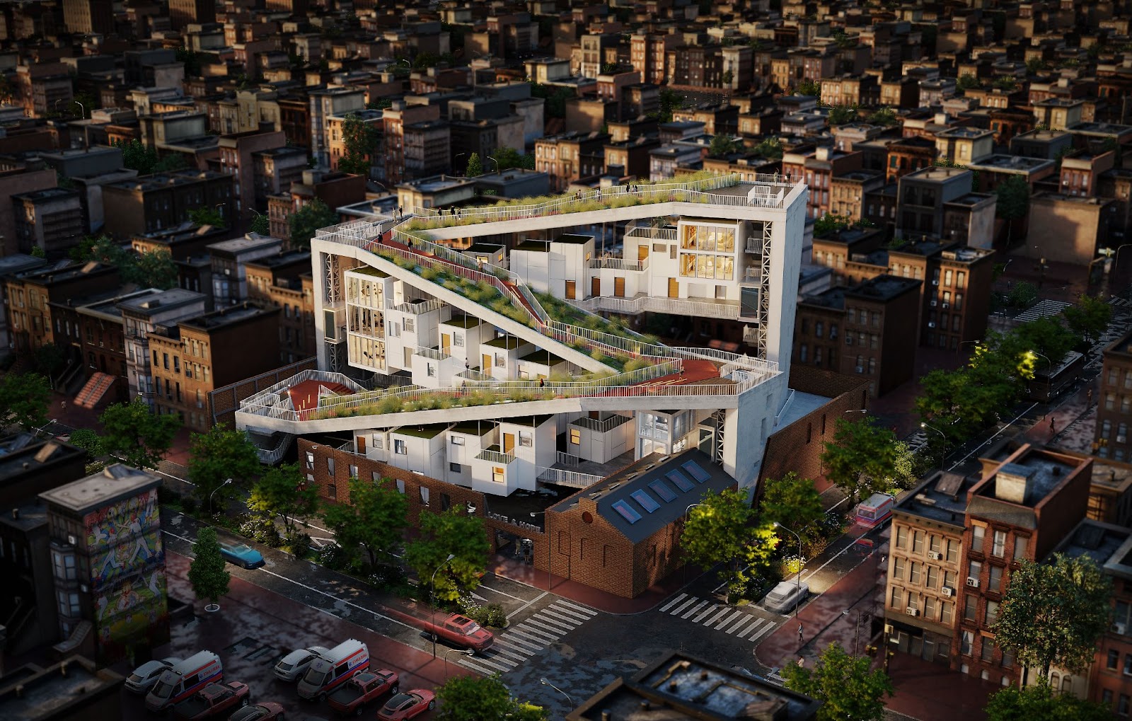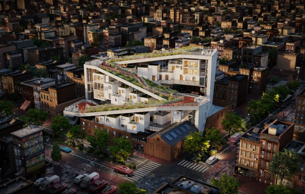 Conceived as transitional housing, the building uses form to express recovery as a gradual, visible process. Its mass twists toward the Philadelphia skyline, framing a view often denied to those living on the streets and turning the city itself into a source of motivation. A continuous ramp rises from ground level to the roof, operating as both circulation and a public promenade. This sloped path invites slow movement, moments of pause and shared encounters, echoing the effort required to rebuild stability. As residents ascend, the city opens up around them, reinforcing a sense of progress through space. The architecture prioritizes openness and access, using the ramp as a civic gesture that links shelter, public life and aspiration into a single spatial journey.