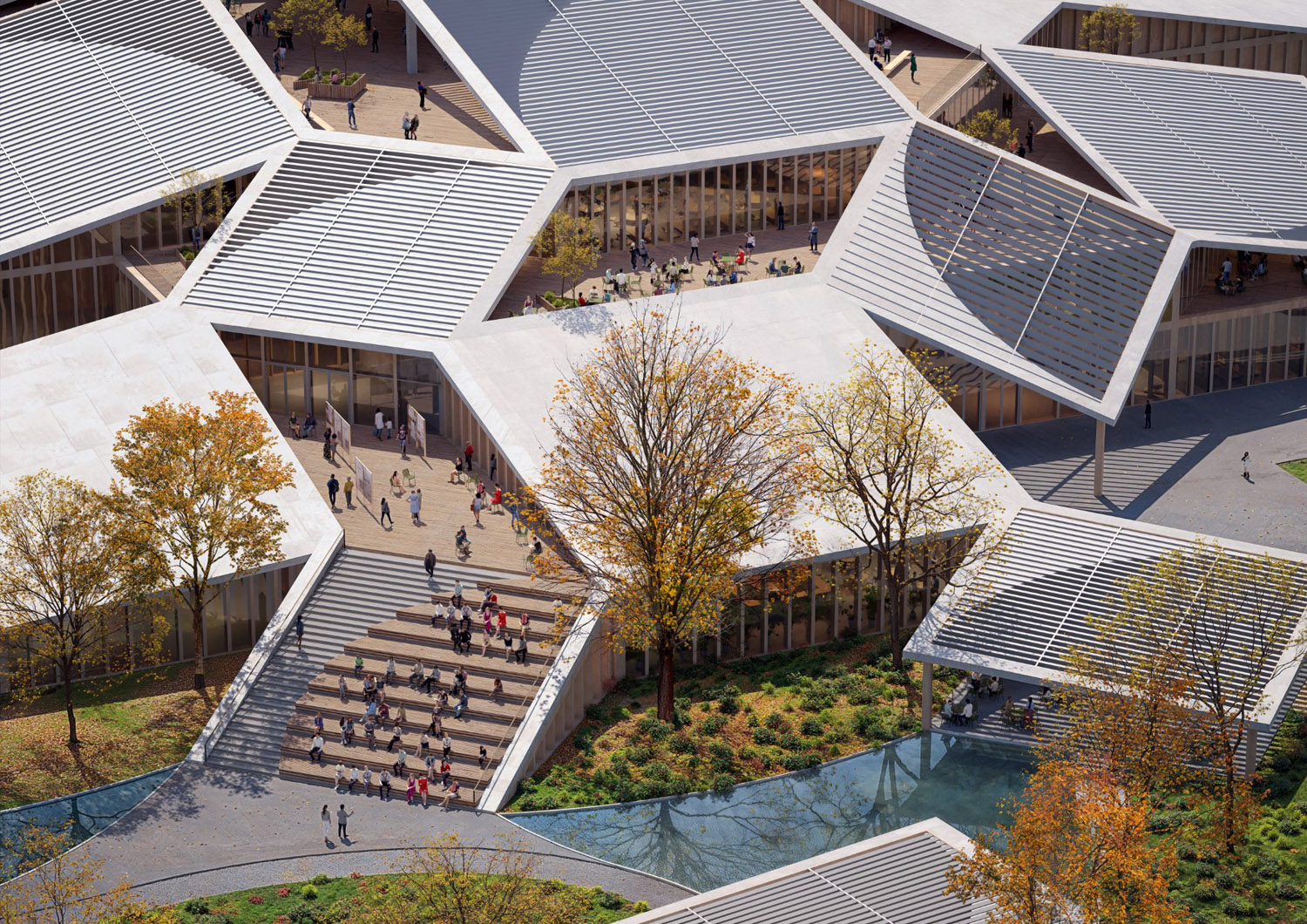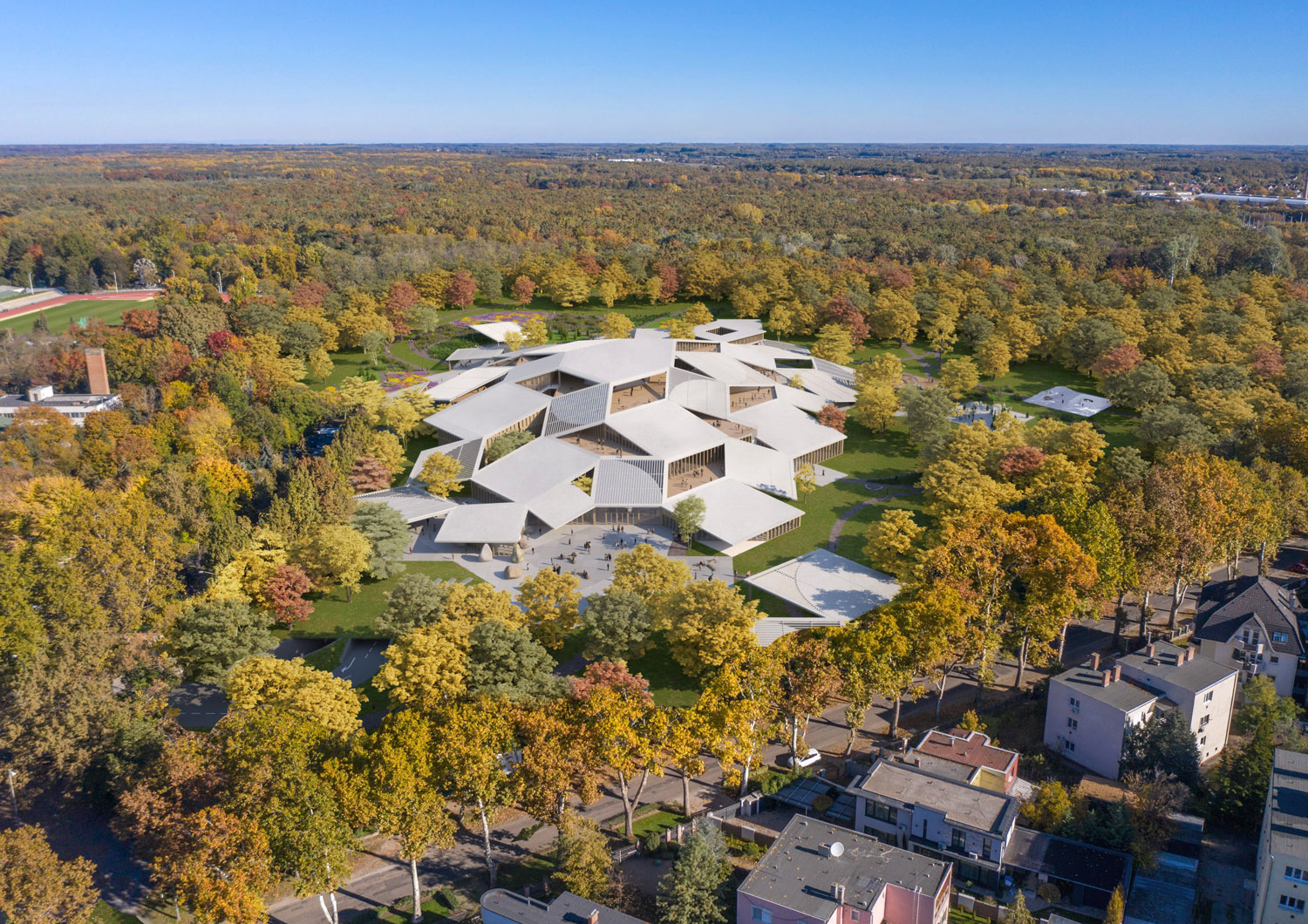 The New Hungarian Natural History Museum is conceived as an extension of the Great Forest, shaped by slow movement across terrain rather than abrupt thresholds. Its terraced form steps gently through the site, allowing ramps and broad stairways to guide visitors along a continuous spatial promenade that alternates between exhibition spaces and open landscape. These sloping paths recall natural topographies, encouraging exploration through gradual ascent rather than formal circulation. Green terraces and roof gardens operate as walkable surfaces, where learning unfolds alongside views toward the zoo and forest canopy. Transparent façades and a lightweight canopy filter light and frame the surroundings, reinforcing the sense that circulation here is less about getting from one level to another, and more about understanding nature through movement and proximity.