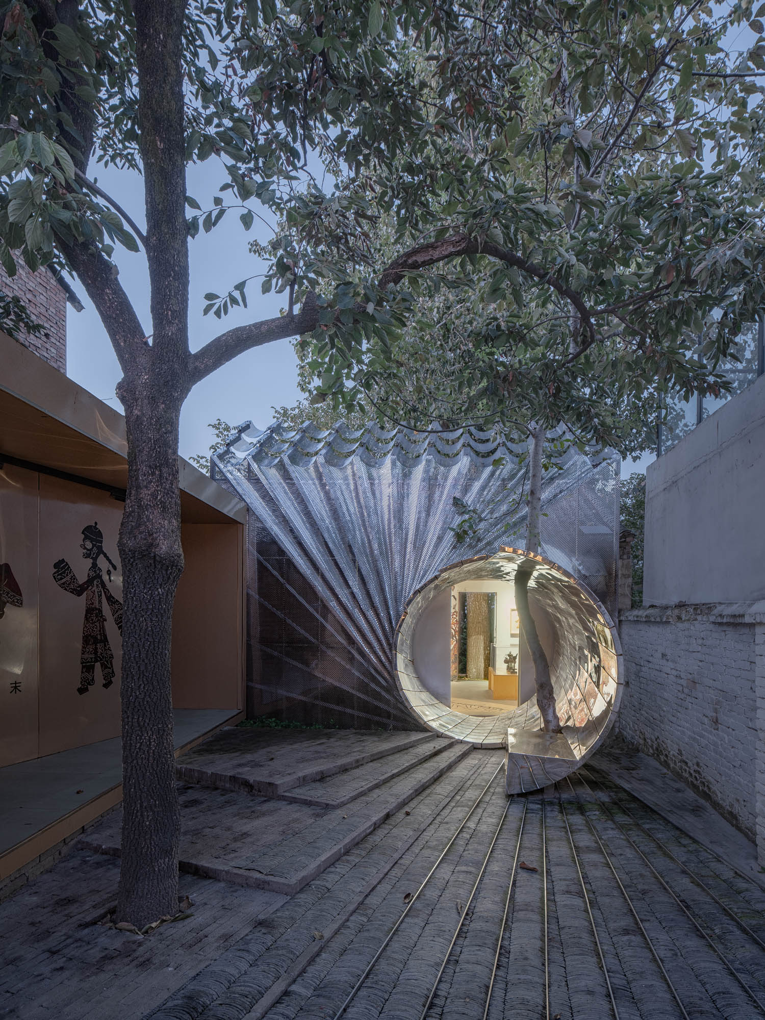 This renovation project transforms a corrupted village courtyard into an exhibition hall for the GuanZhong Mangba Art Festival. Once an abandoned kitchen and warehouse, the site is reimagined through adaptive reuse that enhances function, resilience, and aesthetic continuity. Daipu Architects introduced a dynamic wave-shaped metal facade inspired by local roof tiles. A circular entrance passage activates movement and triggers a rotating mesh system guiding rainwater across the courtyard.