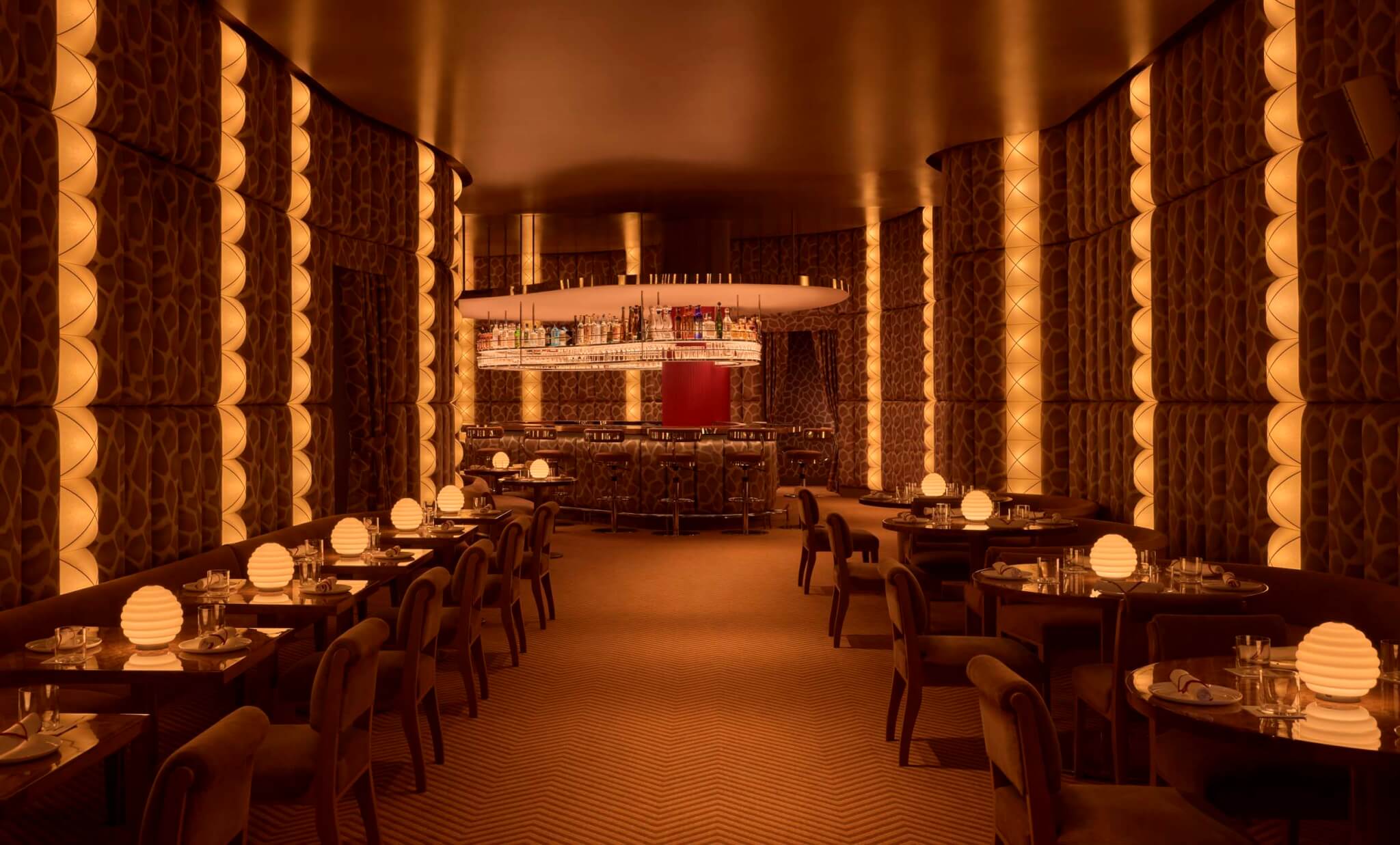 The space uses curves to both organize the flow of the space and accentuate a sensual sculpture. Banquettes, for instance, snake through the interior’s perimeter to face the central bar. This leads the eye down the length of the room, while columns of wall lights create continuity and rhythm. Cruz designed everything in the space, from the giraffe brocade woven in Italy and the carpet made in England to the orb-like table lamps, tweaked to get the illumination just right for making strong eye contact.