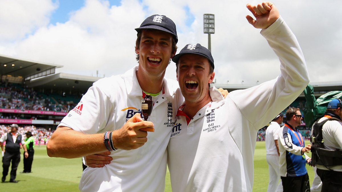 Photo: Steven Finn and Graeme Swann of England pose with the Ashes Urn during day five of the Fifth Ashes Test match between Australia and England at Sydney Cricket Ground on January 7, 2011 in Sydney, Australia. (Photo by Tom Shaw/Getty Images)