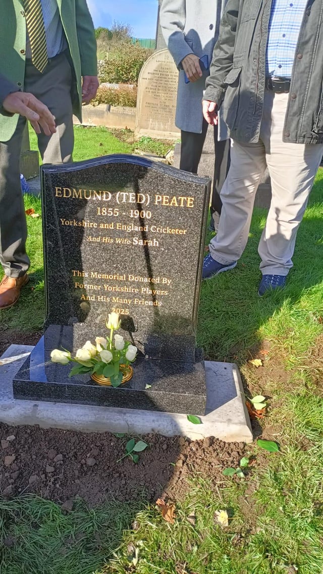 Hello all A little while ago I posted here about my dad’s campaign to get Ted Peate the headstone he never had. Many of you offered kind words, donations, and support which he was grateful for. Yesterday, in a quiet corner of the cemetery, that 125-year wrong was finally set right. On a beautifully sunny day, a small group gathered to remember Peate's name, now etched in stone where it belongs. Thanks to your generosity, book sales, and the help of former Yorkshire players, we were able to honour him. It was a simple, moving moment — and it wouldn’t have happened without the cricketing community. Thank you to you all. submitted by /u/ellirocks |
