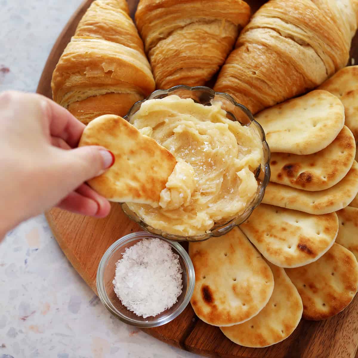 You can use a knife to remove some butter and spread over bread or crackers, or you can dip directly into the board. I like to think of it as the butter version of a cheese plate—it’s a great appetizer or accompaniment to a meal.