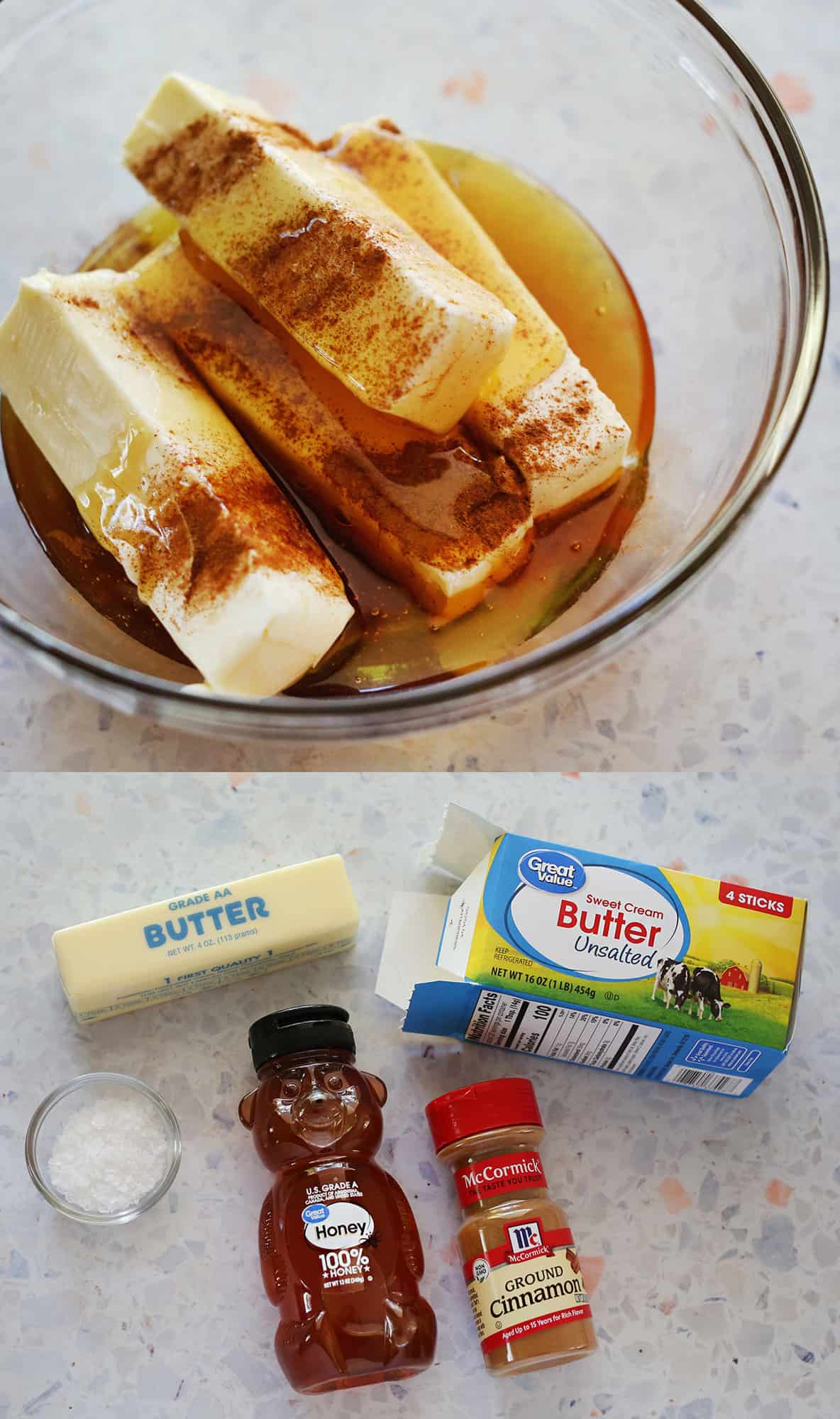 For example, you could use 1/2 cup (1 stick) of butter to 1/4 cup honey. Or 1 cup of butter (2 sticks) to 1/2 cup of honey. You can make larger or smaller batches based on this ratio.