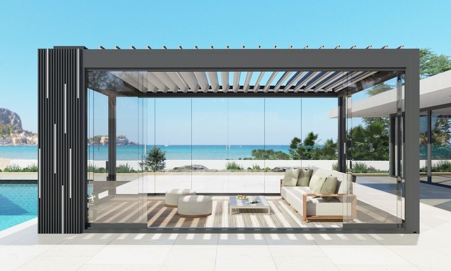 In China, a company called Ombra is building pergolas that are cooled by the sun. The roofs are covered in solar panels that power the HVAC.