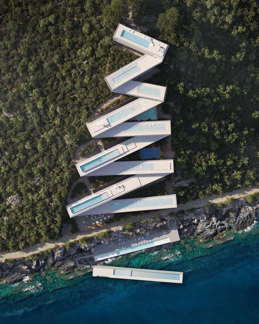 In Albania, Dutch firm JA Joubert Architecture and local firm UNS Architects teamed up on this Zig-Zag resort. The idea was to work with challenging terrain, rather than against it, while providing spectacular views to guests.