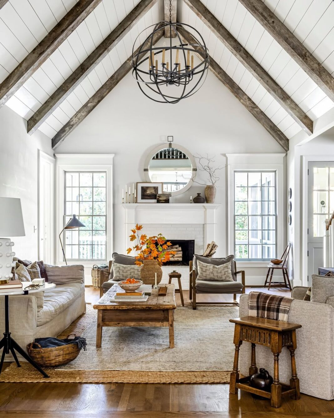 This living room leans hard into farmhouse DNA—exposed beams, soft neutrals, and furniture that looks like it’s meant to be lived in, not tiptoed around. The layered rugs and warm woods instantly set that slow, Sunday-morning mood.