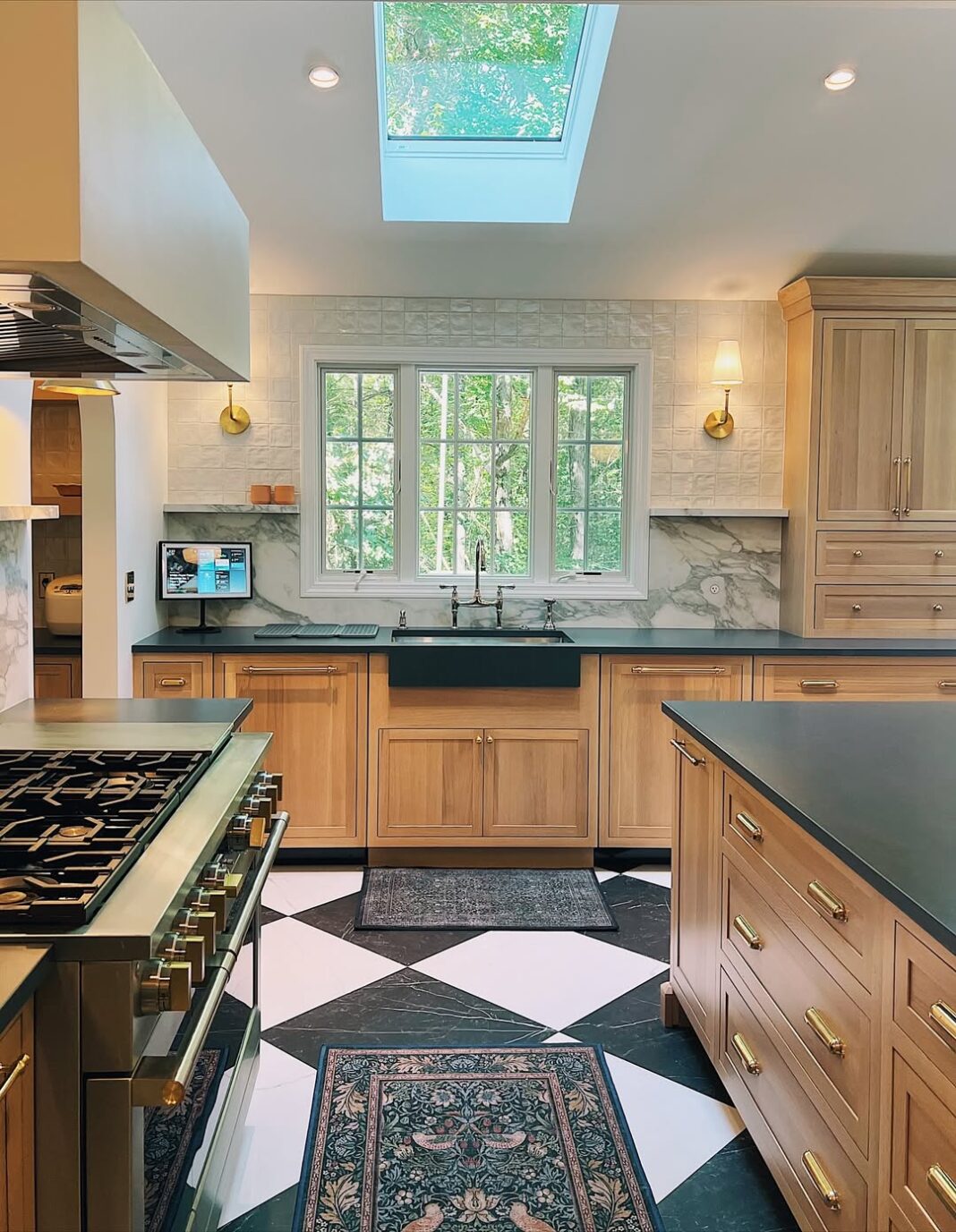 This kitchen is a study in bold elegance. The oversized checkered marble floor makes a striking first impression, softened beautifully by warm oak cabinetry and unlacquered brass hardware. There’s balance in every detail—from the veined stone backsplash to the unexpected pop of forest green through the skylight.
