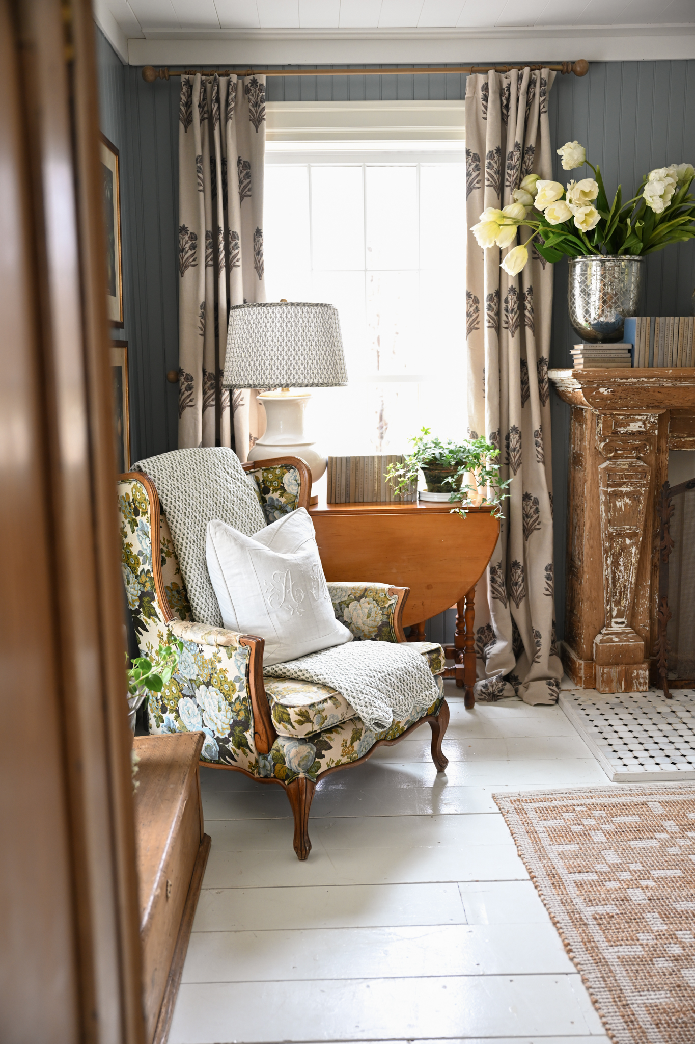 I’m so excited to share a recent transformation in our cozy cottage—the front living room has been given a fresh new look with a beautiful shade of blue. We chose Farrow & Ball’s De Nimes, but to achieve a lighter, more personalized touch, we had it mixed at 50% lighter.