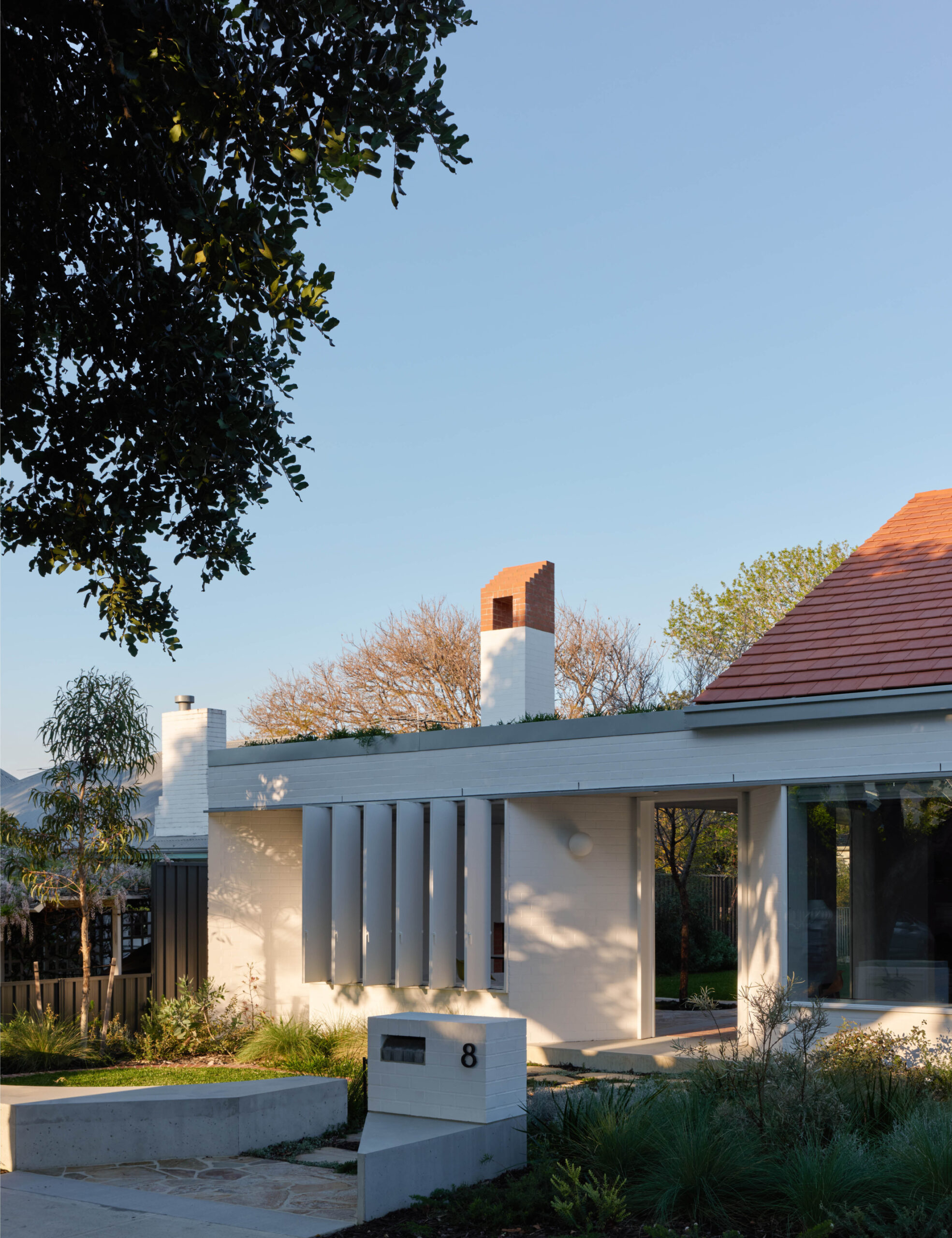The material palette speaks to the surrounding houses, most of which are modest single-storey postwar cottages built by the state government, featuring white painted masonry walls, pitched terracotta roofing, and stepped chimney forms.