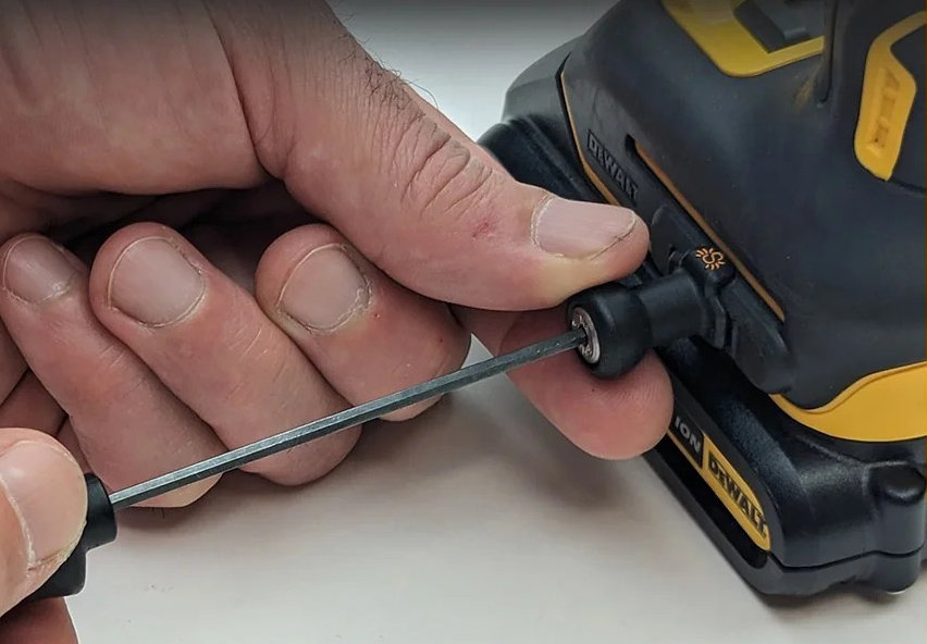 To remove the drill, the user must lift the yellow latch with their thumb.