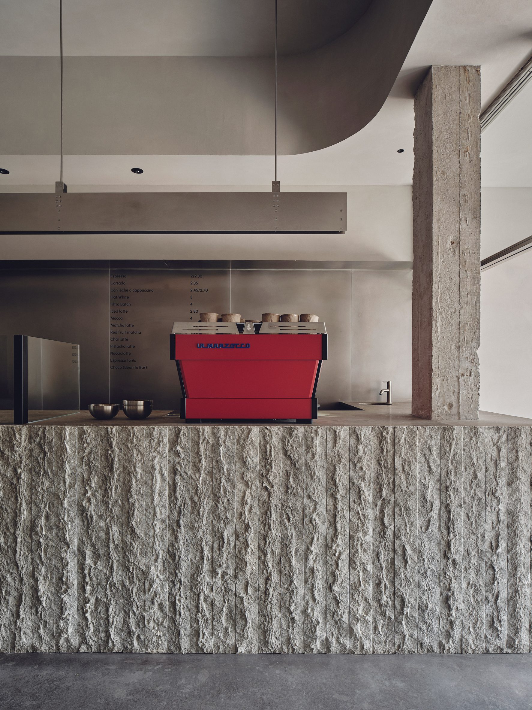 The architecture studio was asked by the client to design “a completely different space” that the city did not yet have by combining a coffee shop and bakery while appealing to a younger, sport-oriented lifestyle demographic active on social media.